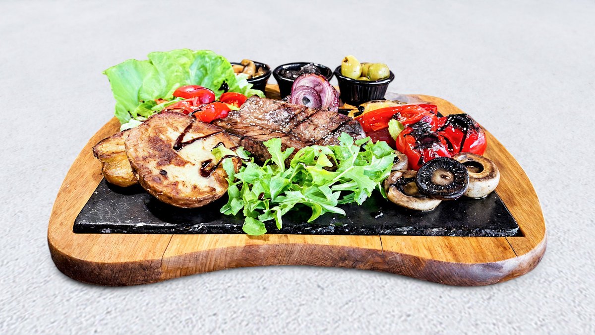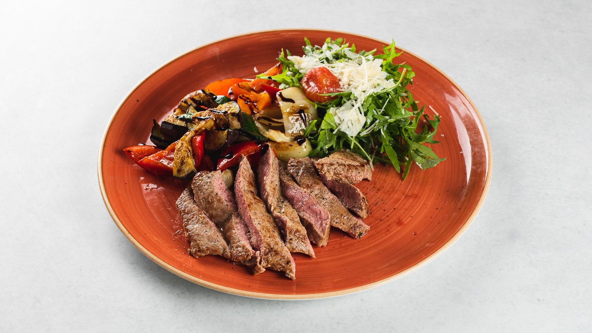 Ramstek isečen na tanke listove, zapečen krompir u ljusci, grilovano povrće, rukola, čeri paradajz