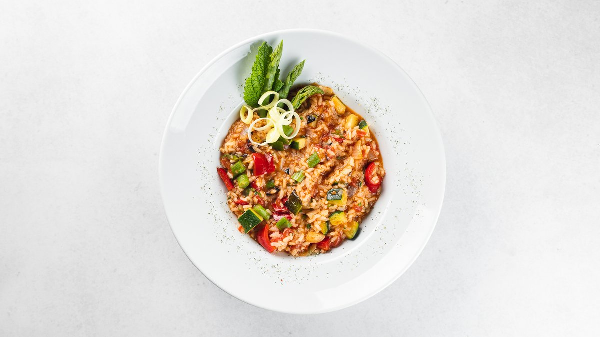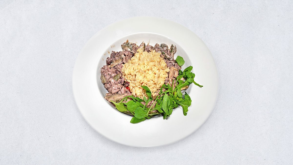 Biftek, pečurke, paprika, luk, pirinač, kremasti sos, parmezan