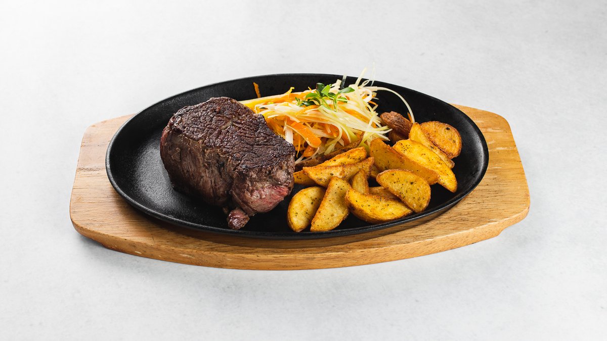 Biftek isečen na tanke listove, zapečen krompir u ljusci, grilovano povrće, rukola, čeri paradajz