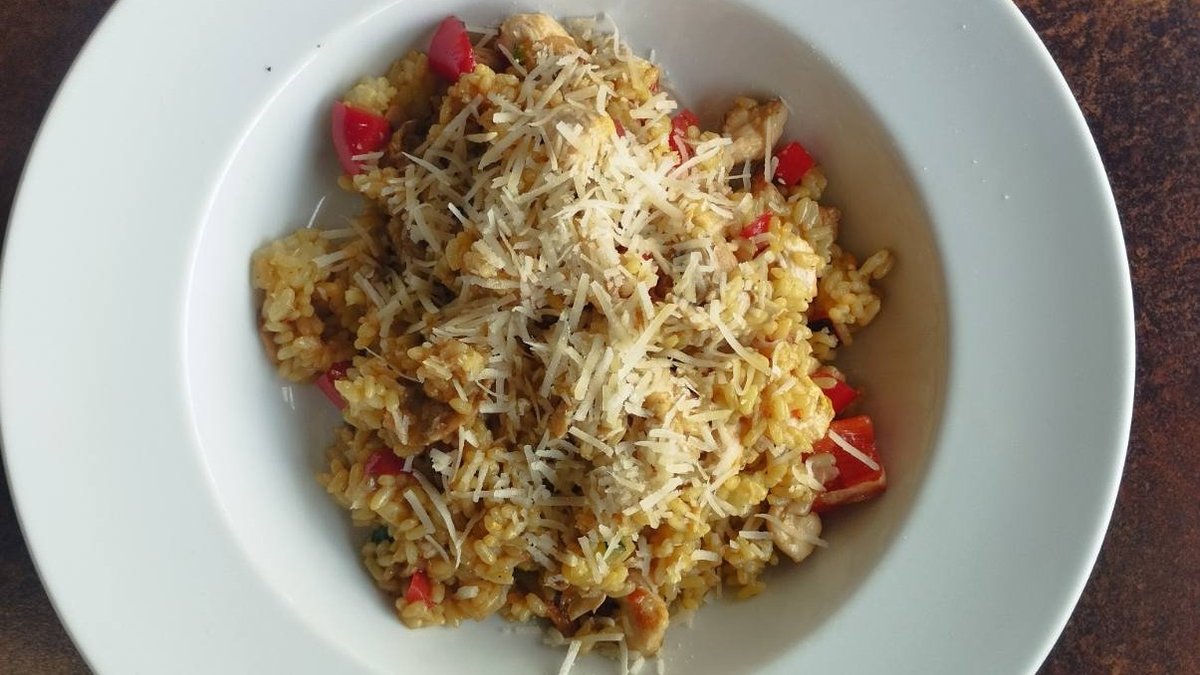 Komadići piletine, pirinač, pečurke, paprika, tikvica, soja sos, parmezan