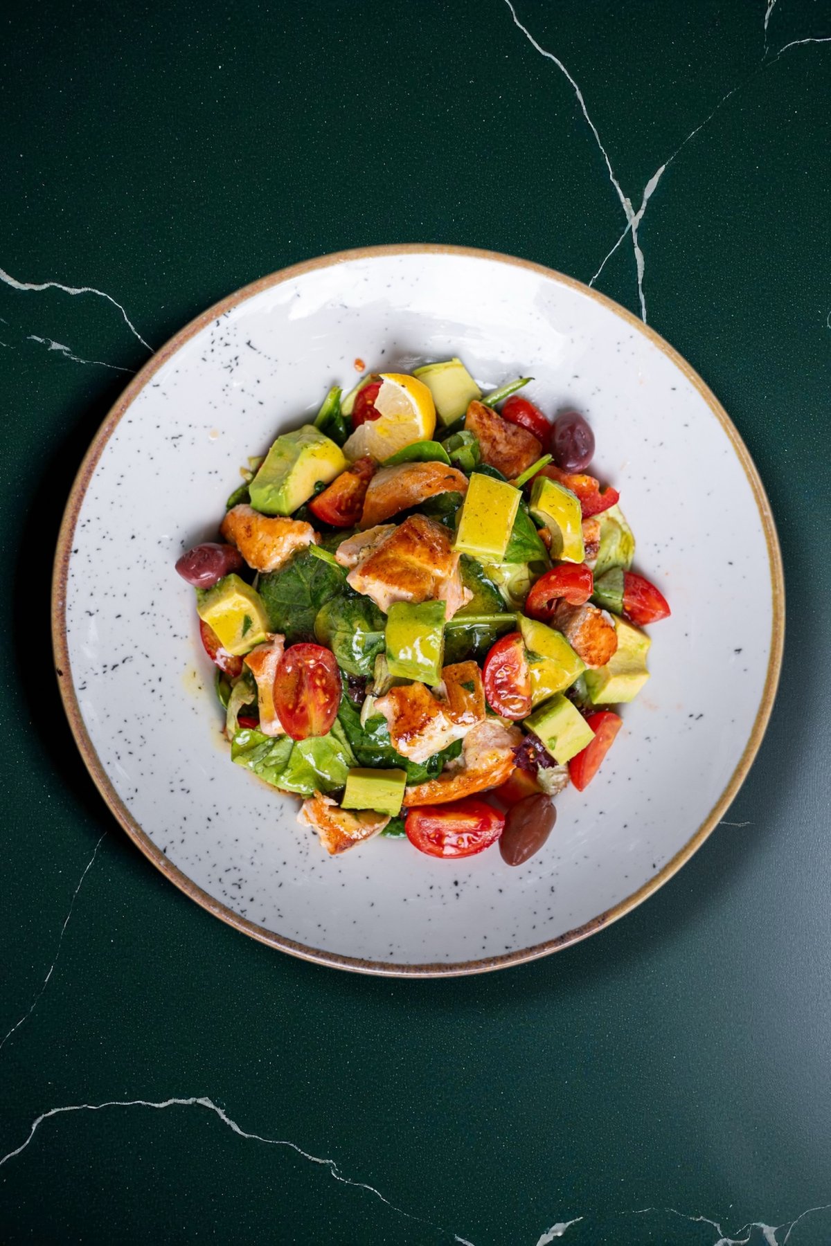 miks salata, losos, čeri paradajz, limun, spanać, avokado