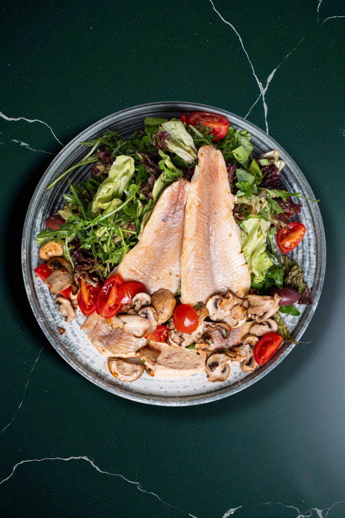 miks salata, dimljena pastrmka, grilovani čeri paradajz i šampinjoni, masline, preliv