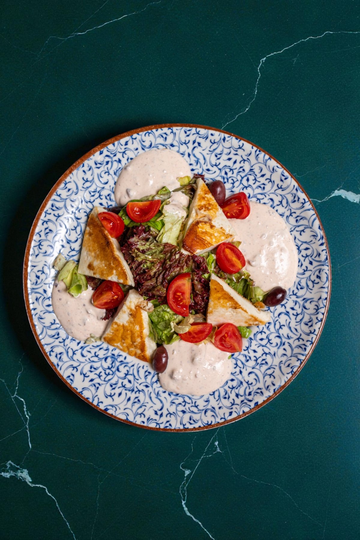 zelena salata, čeri paradajz, grilovani kozji sir, pavlaka, badem, ljuti sos