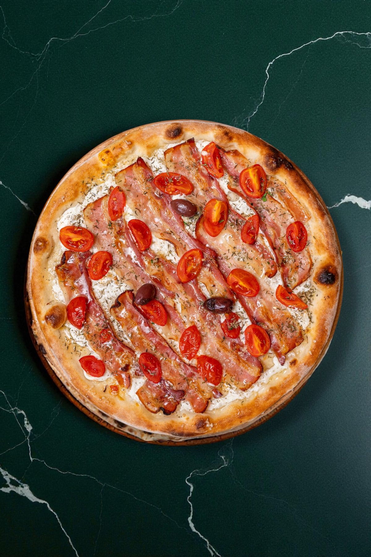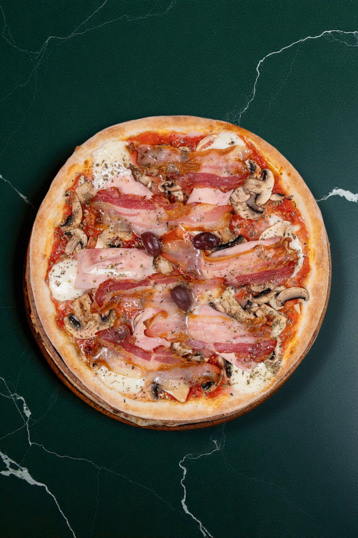 pelat, mocarela, šunka, pavlaka, pančeta, pečurke, masline, origano