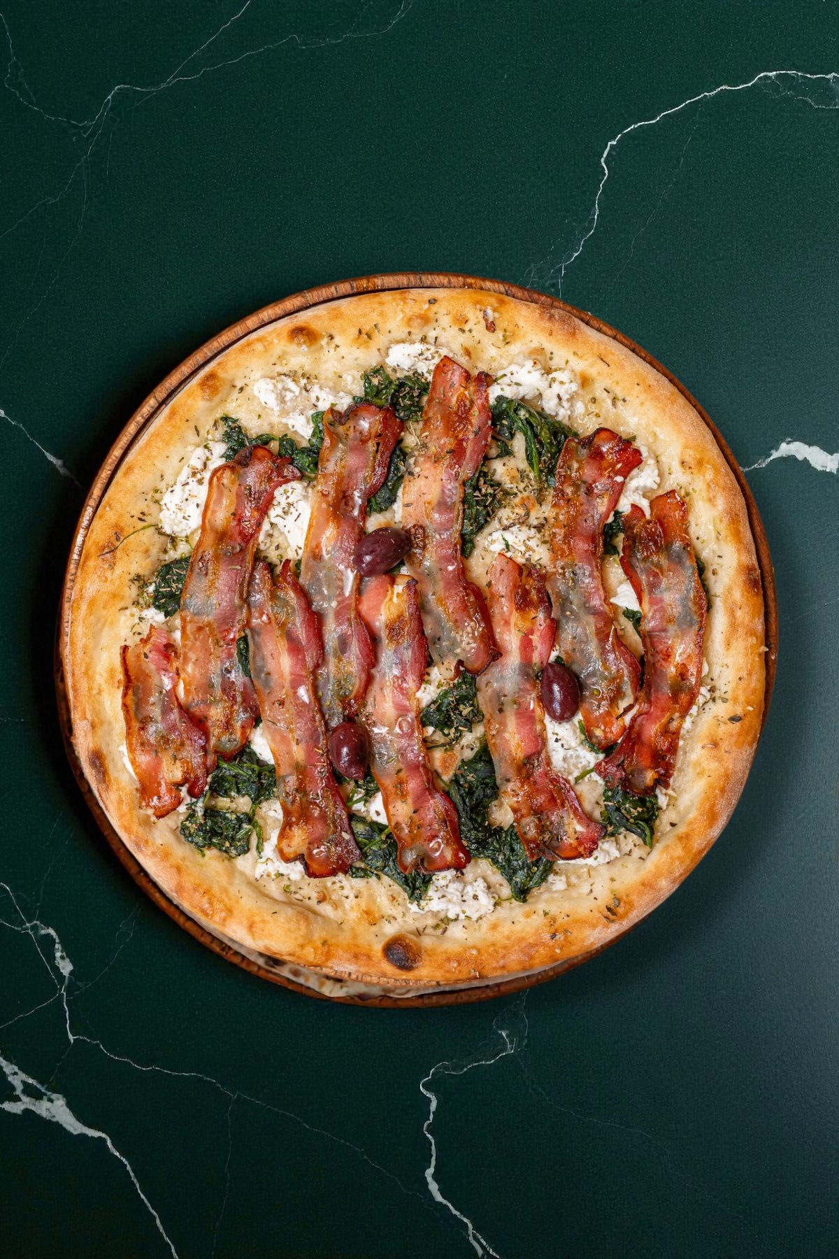 rikota sir, spanać, pančeta, beli luk, masline, origano