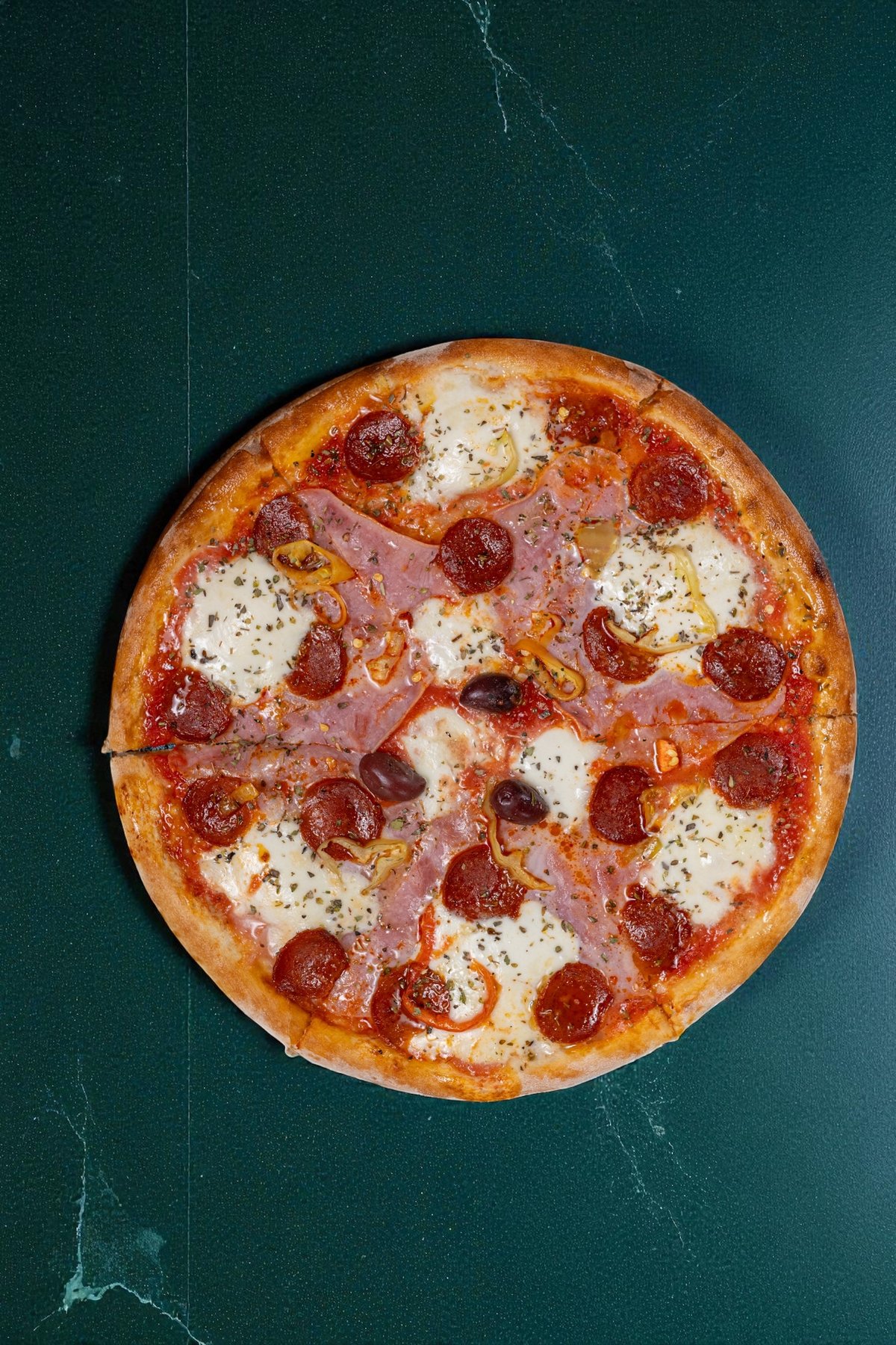 mocarela, pelat, šunka, peperoni, ljuta paprika, beli luk, masline, origano