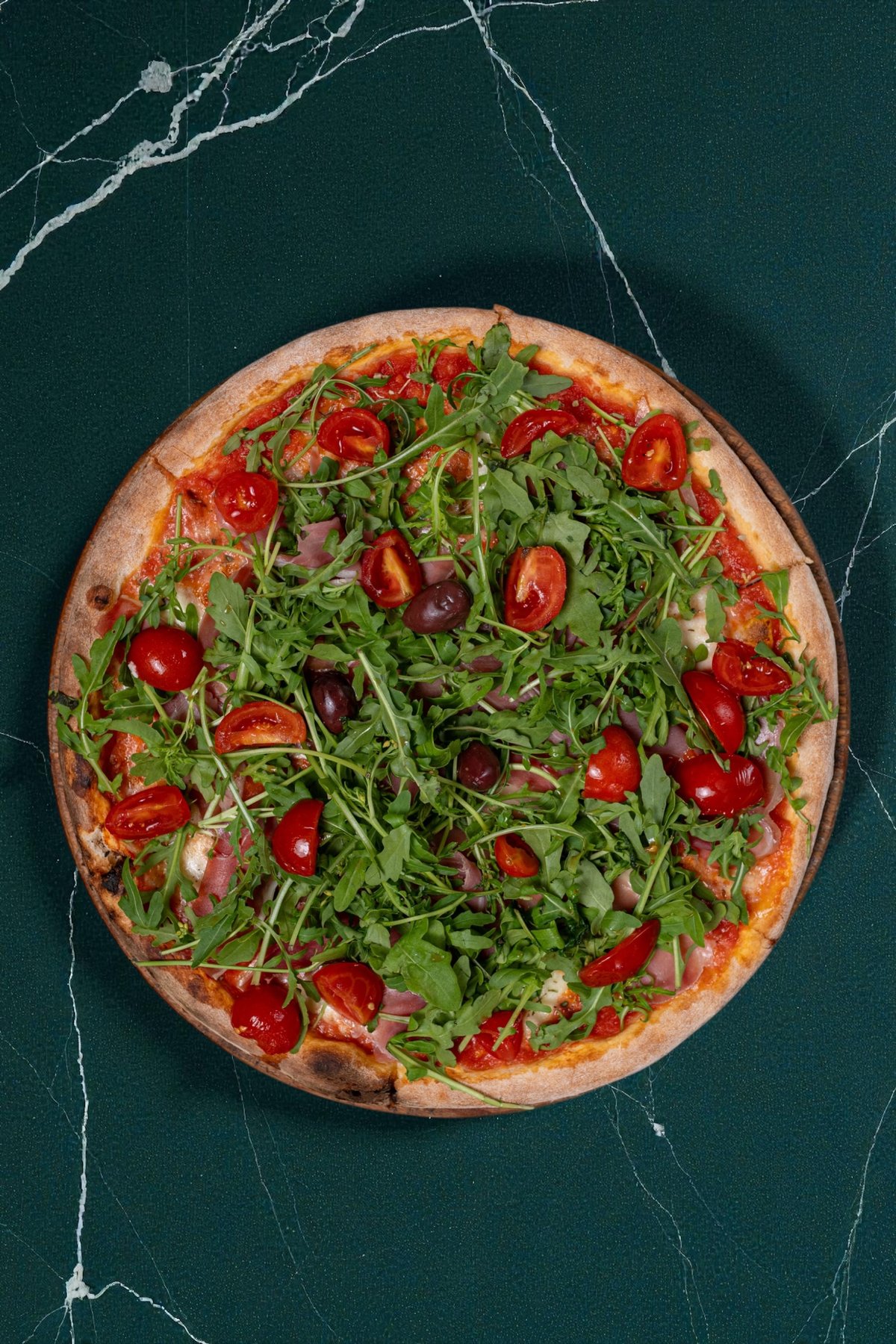 pelat, mocarela, čeri paradajz, pršuta, rukola, origano, masline