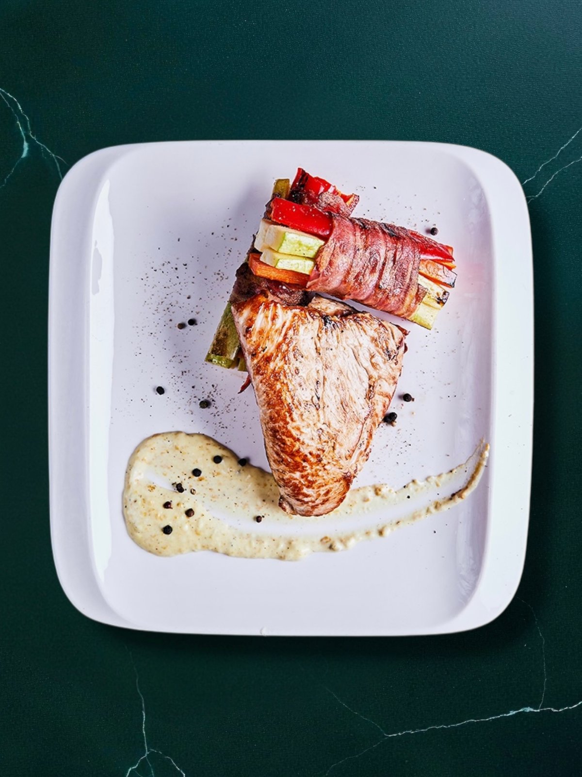 ćuretina, praziluk, bosiljak, pekorino, sušeni paradajz, puter, mocarela, belo vino