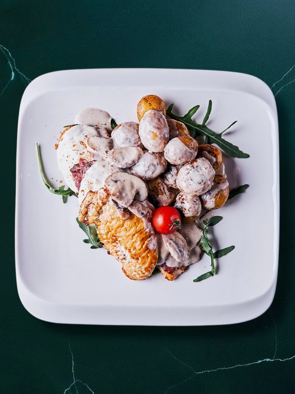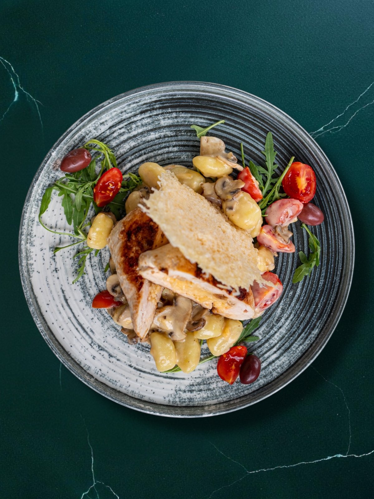 piletina punjena dimljenim sirom i smokvama, sa kremastim njokama kao prilog