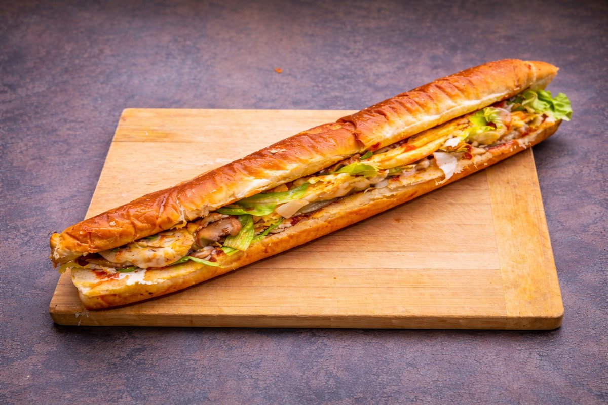 Kifla, 3 vrste kačkavalja, marinirane pečurke, marinirani pileći file, paradajz, ajzberg salata, sos po izboru
