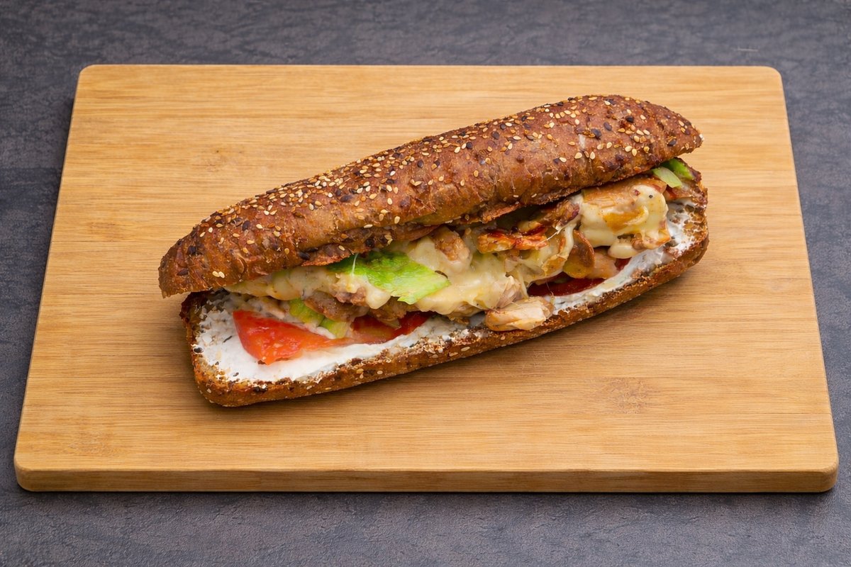 Proteinska kifla, pileći file, 3 vrste kačkavalja, marinirane pečurke, icebrg salata, paradajz, pavlaka, ranč sos