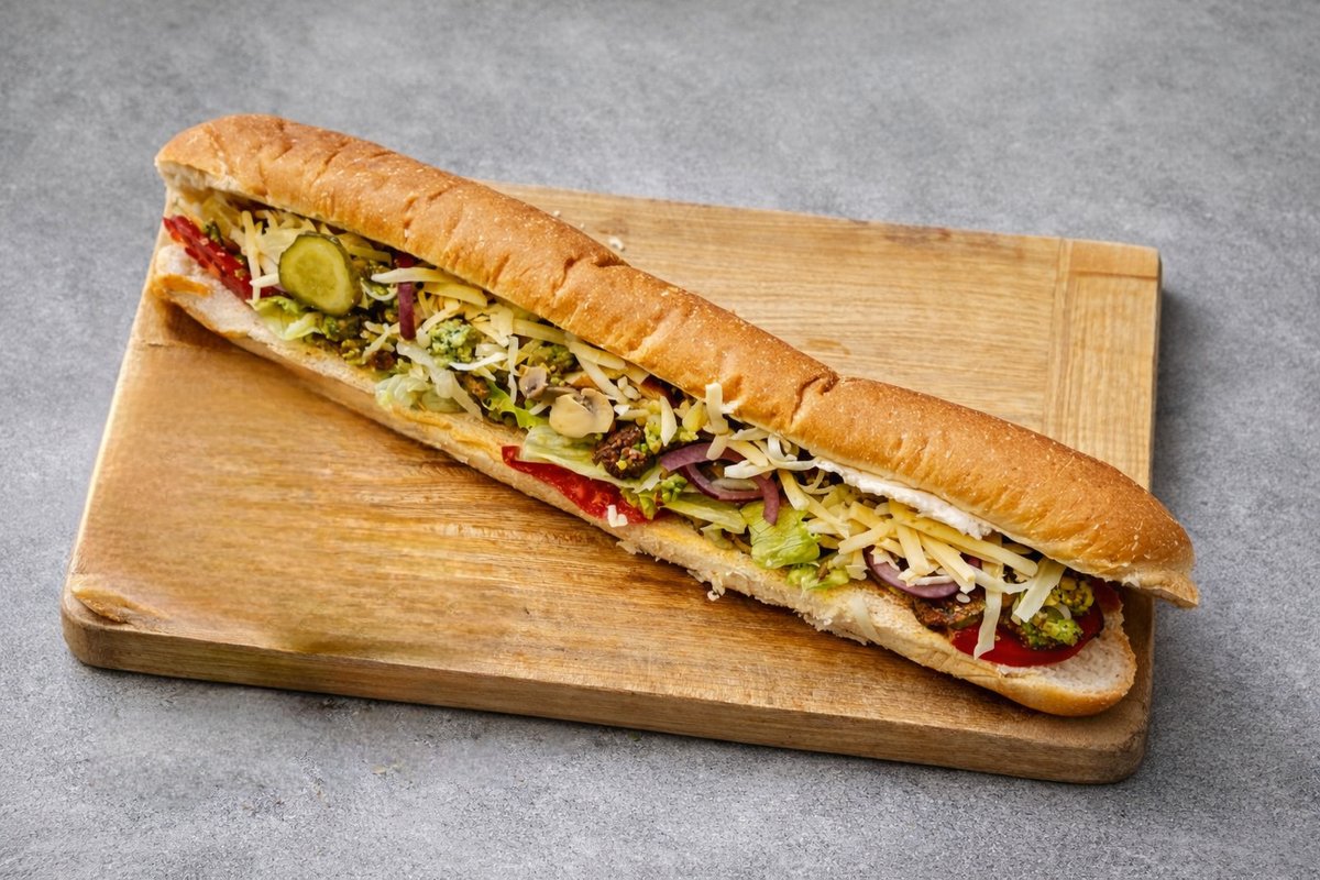Kifla, falafel, 3 vrste kačkavalja, marinirane pečurke, krem sos od belog luka, krastavac, paradajz, crveni luk, tartar sos, ajzberg salata