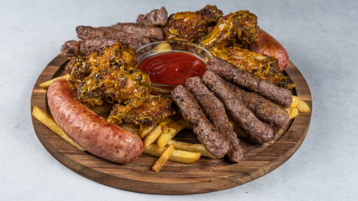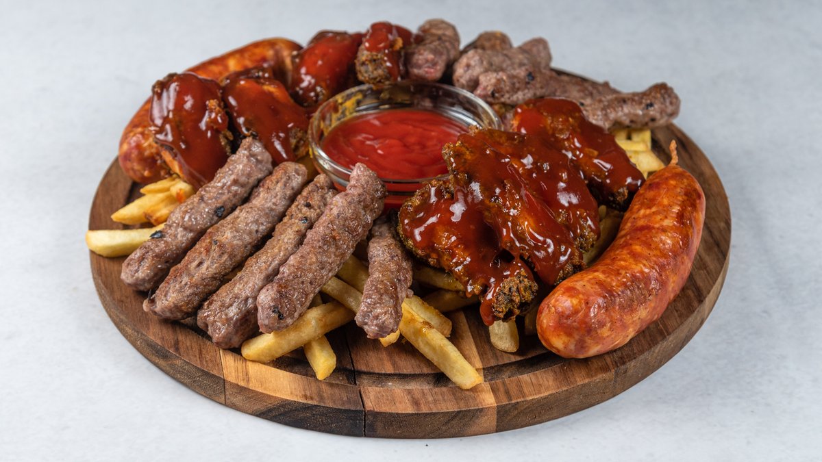 Ćevapi 300g, kobasica krajnska 300g, krilca hrskava 500g, pomfrit 300g