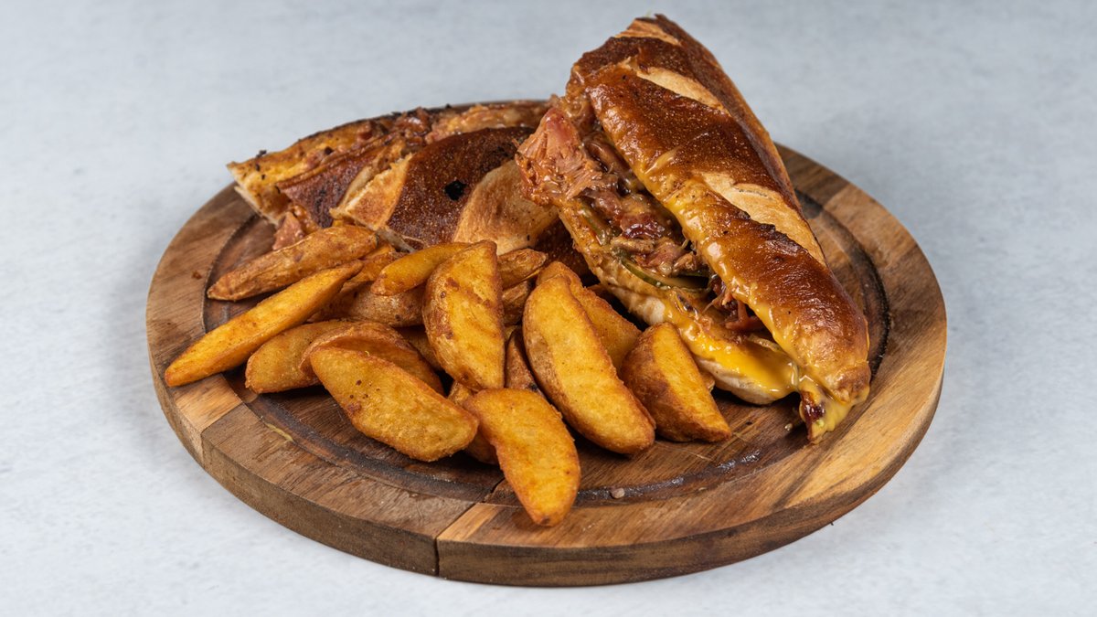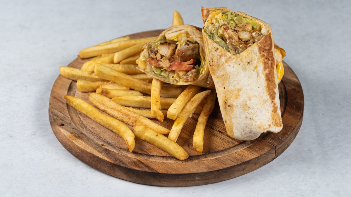 Tortilja, marinirani batak, čedar, edamer, krastavčići, iceberg, paradajz, garlic mayo, pomfrit 150g