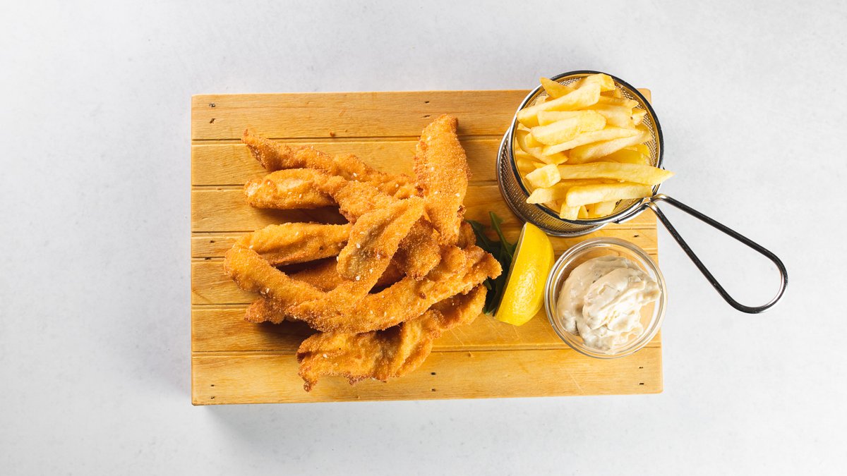 Pohovano pileće belo meso u papriko prezli, pomfrit 150g, garlic mayo