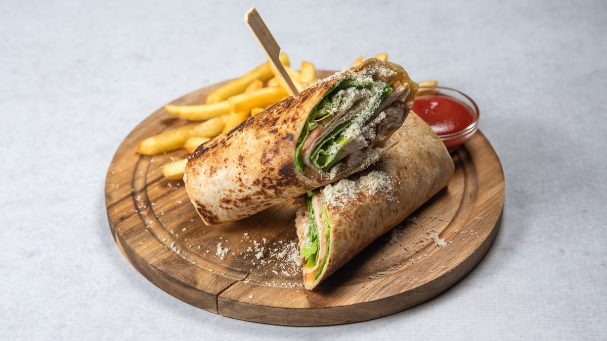Tortilja Cezar dresing Zelena salata Paradajz Pileći file Slanina Parmezan Pomfrit Kečap