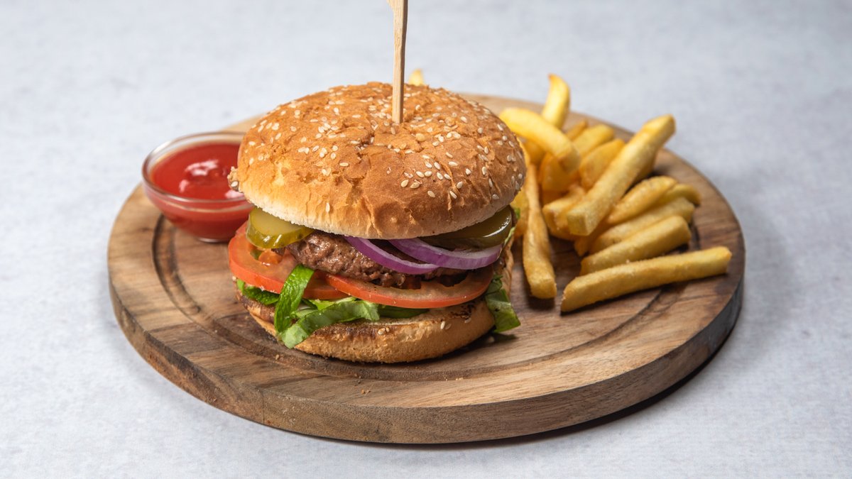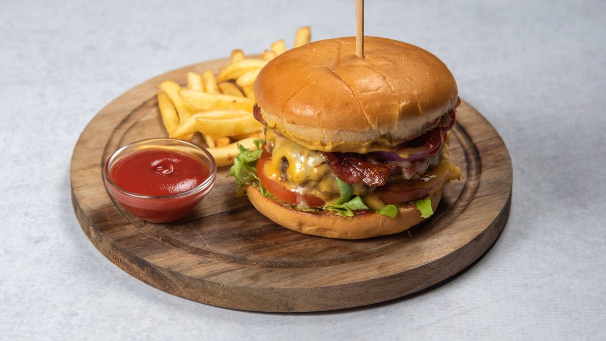 Juneće meso 200g, bbq sos, iceberg, paradajz, slanina crispy, čedar, edamer, pomfrit 150g, kečap