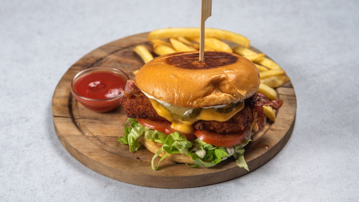 Pohovana piletina 180g, iceberg, paradajz, krastavčići, crispy slanina, čedar, garlic mayo, sweet chilli