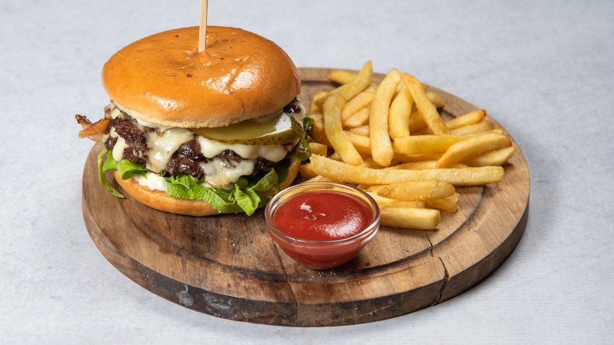 Zemička Garlic mayo Zelena salata Paradajz Krastavčići 2x 110g juneće mleveno meso Dimljeni sir Karamelizovani luk Pomfrit Kečap
