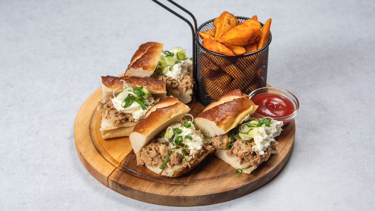 Bavarska kifla, sporo kuvana butkica u bbq sosu, čedar, krastavčići, vedzis 150g