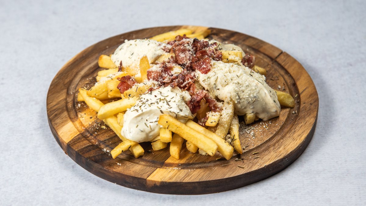 Pomfrit Garlic mayo Crispy bacon Parmezan