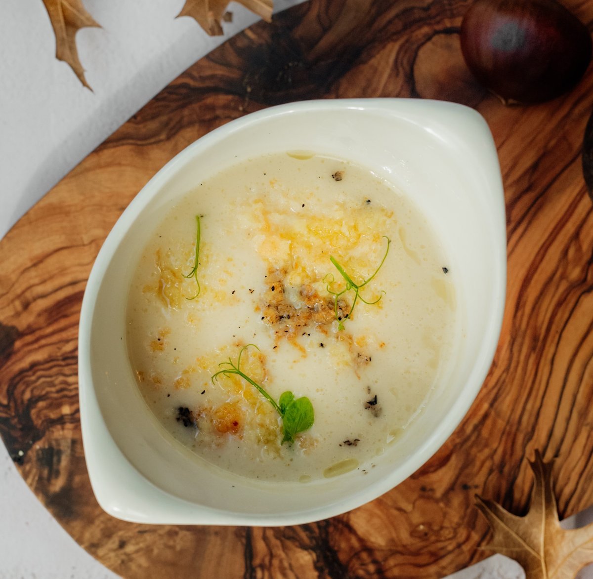 Krem supa od celera, kranč od kozijeg sira, ribani tartufi