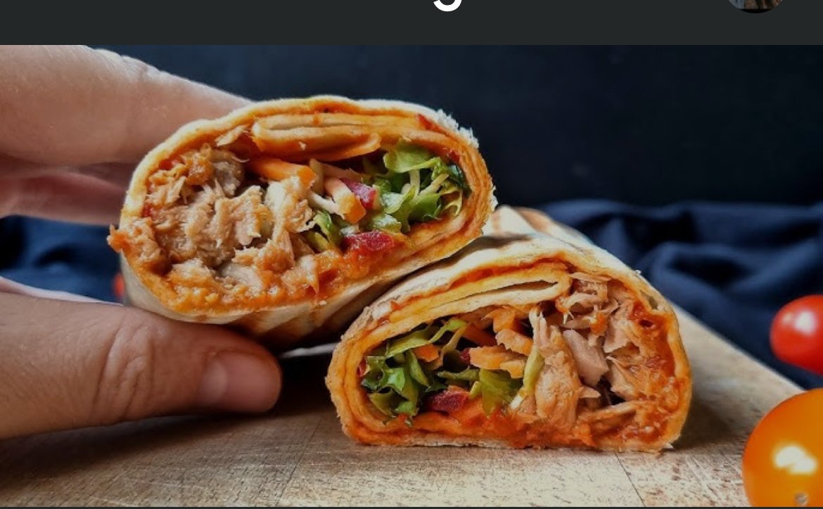 Tortilja od domaćeg testa, grilovana piletina, pub sos, grilovane pečurke u kari i soja sosu, gauda, ajzberg, paradajz