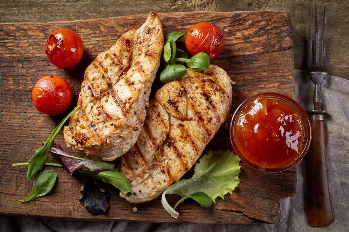 Marinirana grilovana piletina, pančeta, masline, parmezan, paradajz, ajzberg, dresing