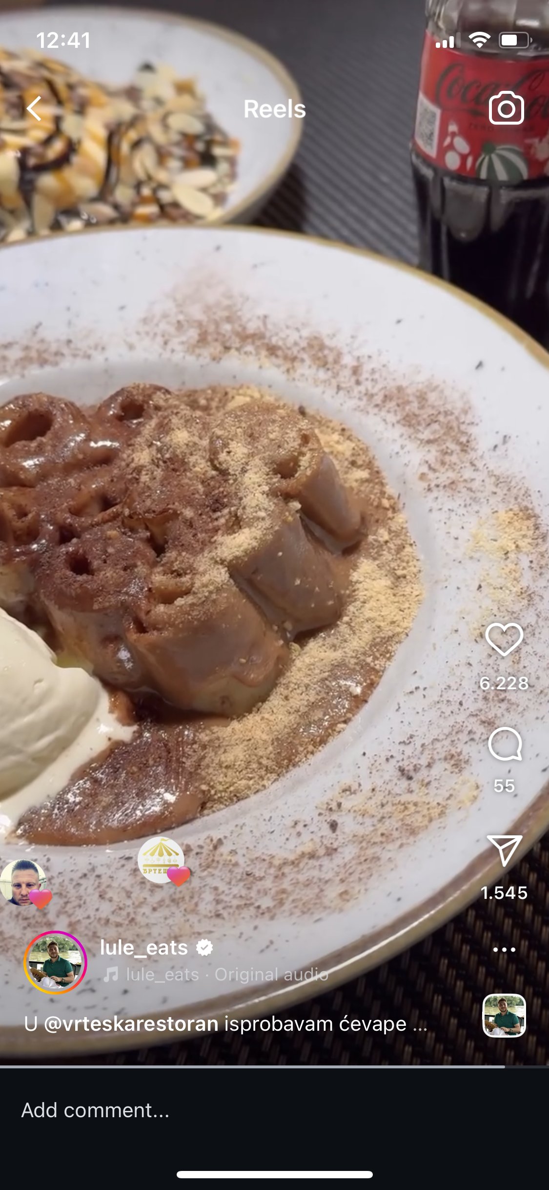 Rolovana palačinka sečena na zalogaje, prelivena eurokremom i plazmom, sa kuglom sladoleda