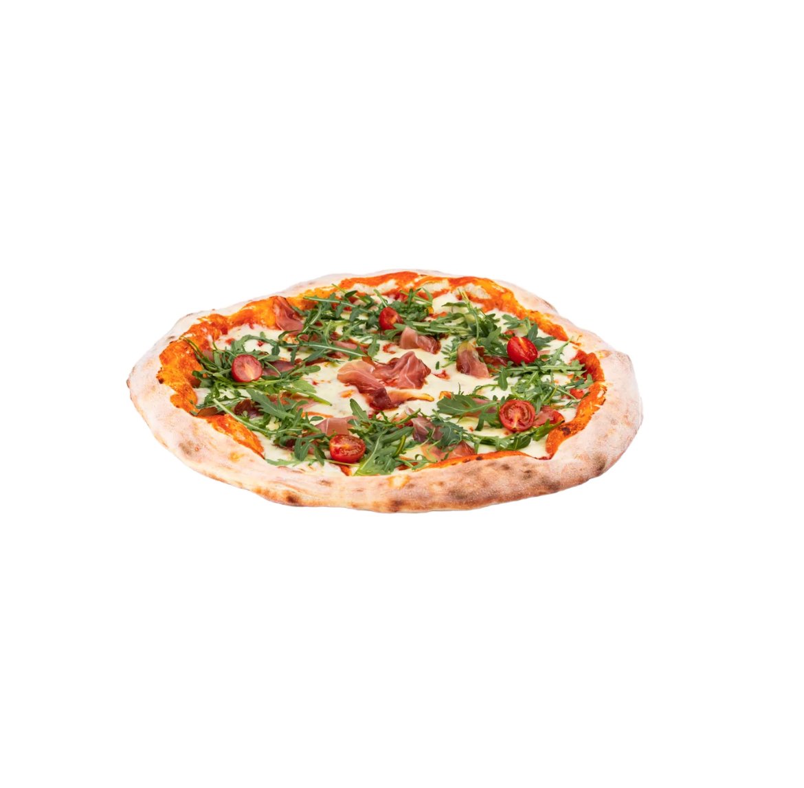 Neutralna pavlaka, njeguški pršut, mocarela, čeri paradajz, rukola, parmezan