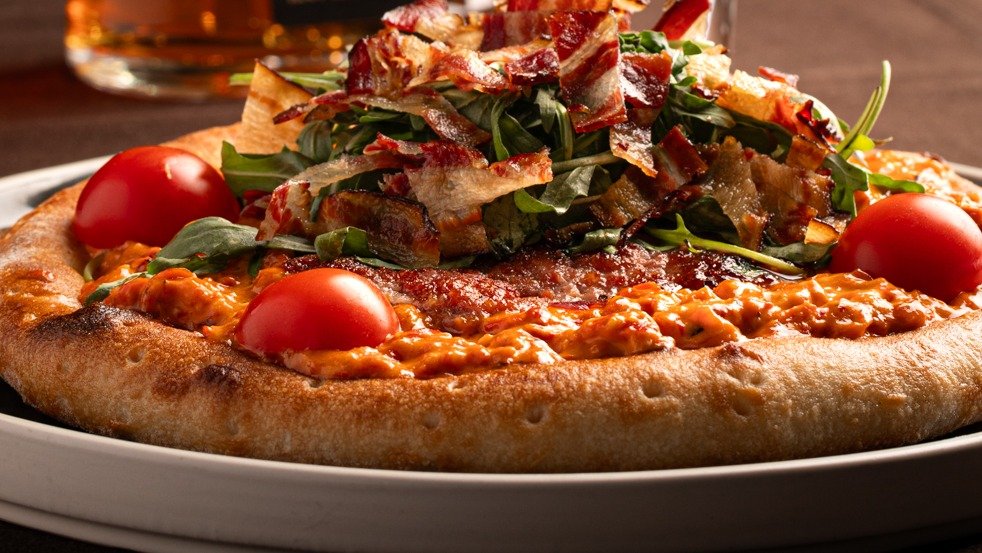 Pelat, mocarela, šunka, pančeta, pavlaka, čeri paradajz, beli luk, maslinovo ulje