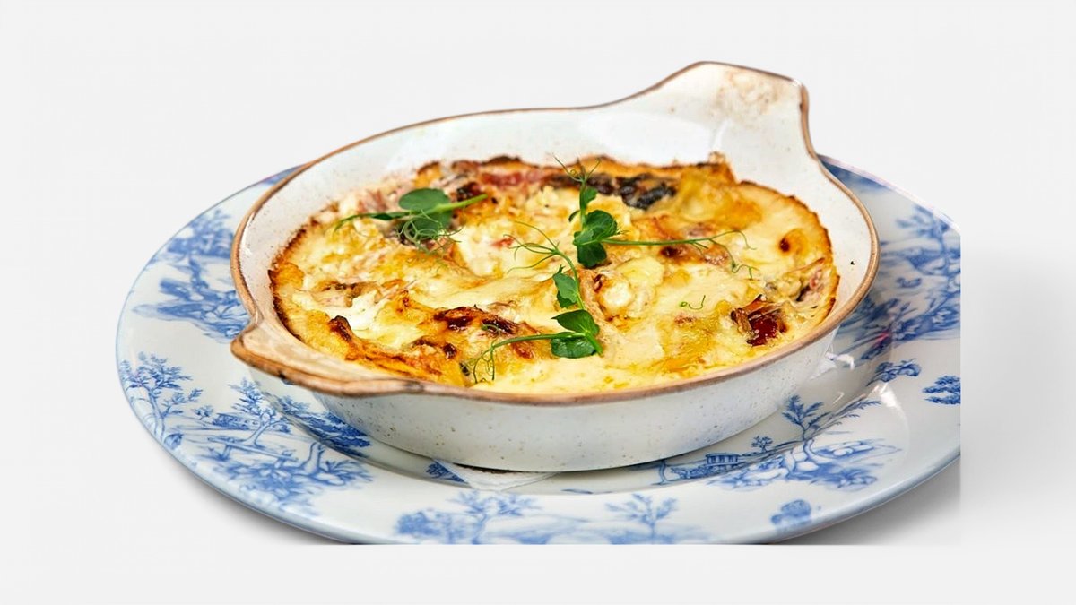 Pileća džigerica rolovana belom vešalicom i slaninom, preliveno kajmakom I mladim lukom pa zapečeno u peći