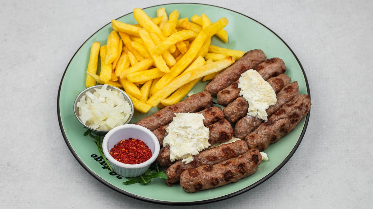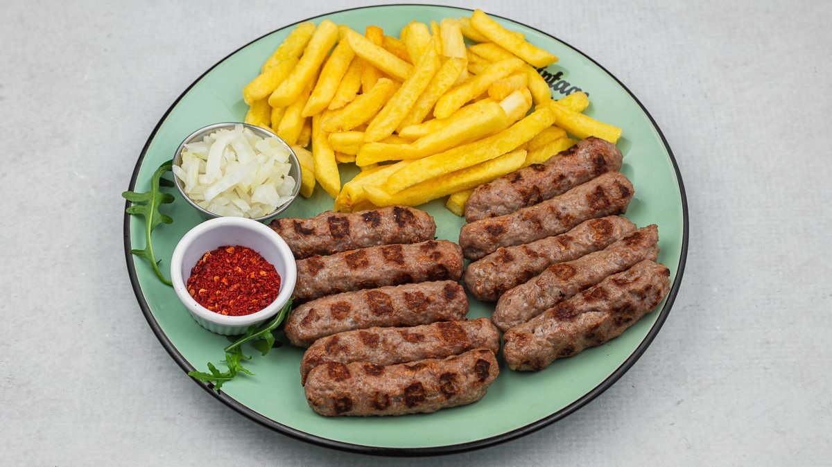 vrat, rolovani pileći ražnjić, ćevapi, kobasica, pileće belo, pomfrit …po 200gr