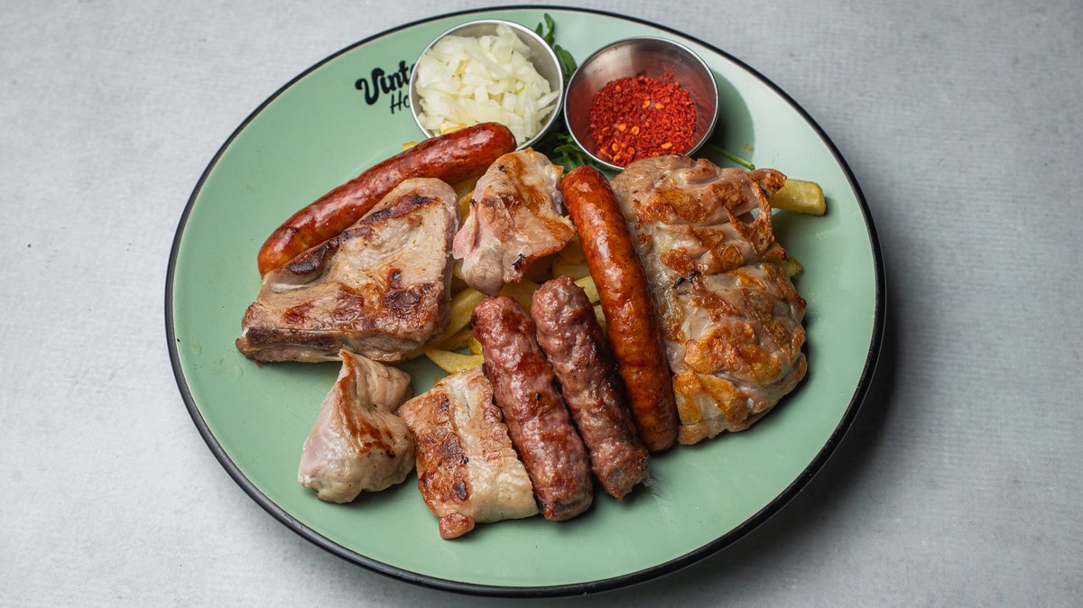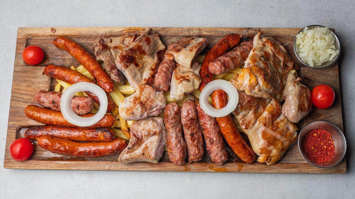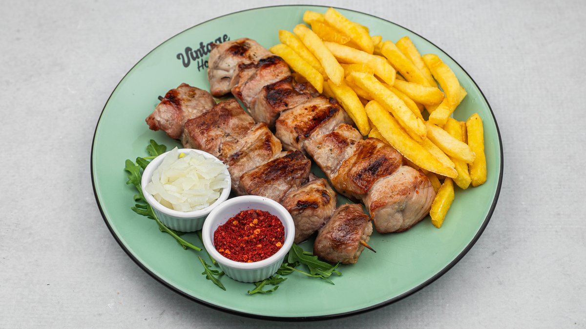 vrat, rolovani pileći ražnjić, ćevapi, kobasica, pileće belo, pomfrit …po 100gr