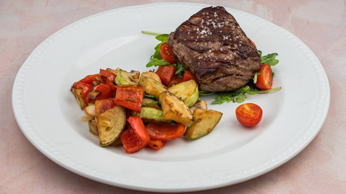 Biftek na maslinovom ulju posluzen sa grilovanim pecurkama, tikvicama I paprikom
