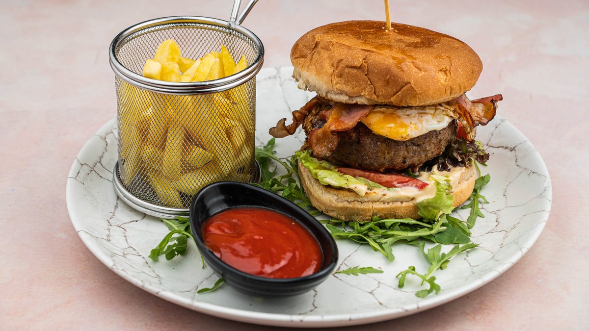 Zemicka, junetina, cedar sir, paradajz, panceta, hrskavi luk, bbq sos, pomfrit