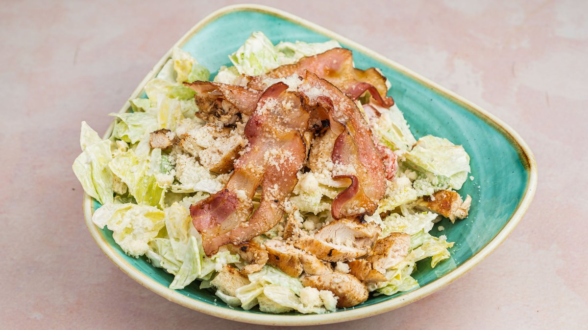 Piletina, iceberg salata, cezar dresing, panceta, parmezan, ceri paradajz, krutoni