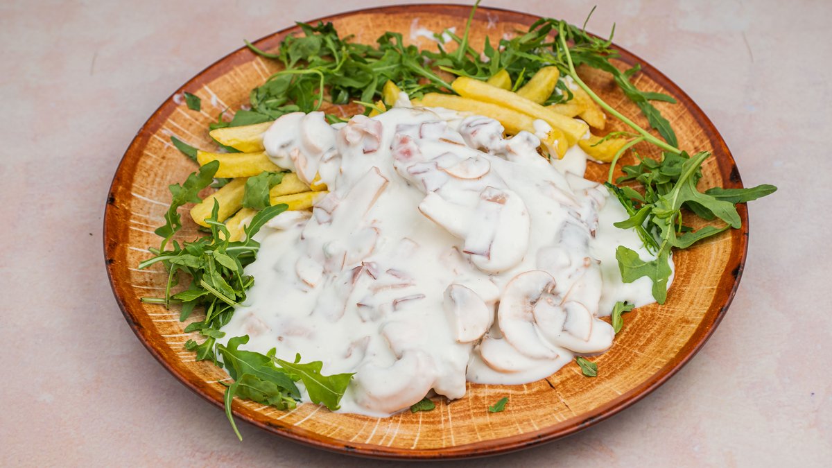 Piletina u kremastom sosu od pecuraka, Panceta, I pomfrit