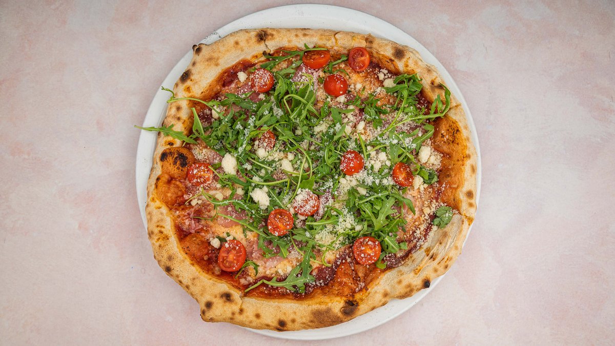 Pica testo, pelat, kackavalj, prsuta, rukola, ceri paradajz, parmezan