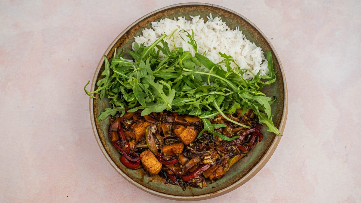 Tikvice, paprika, pecurke, kupus u soja sosu, basmati pirinac, piletina