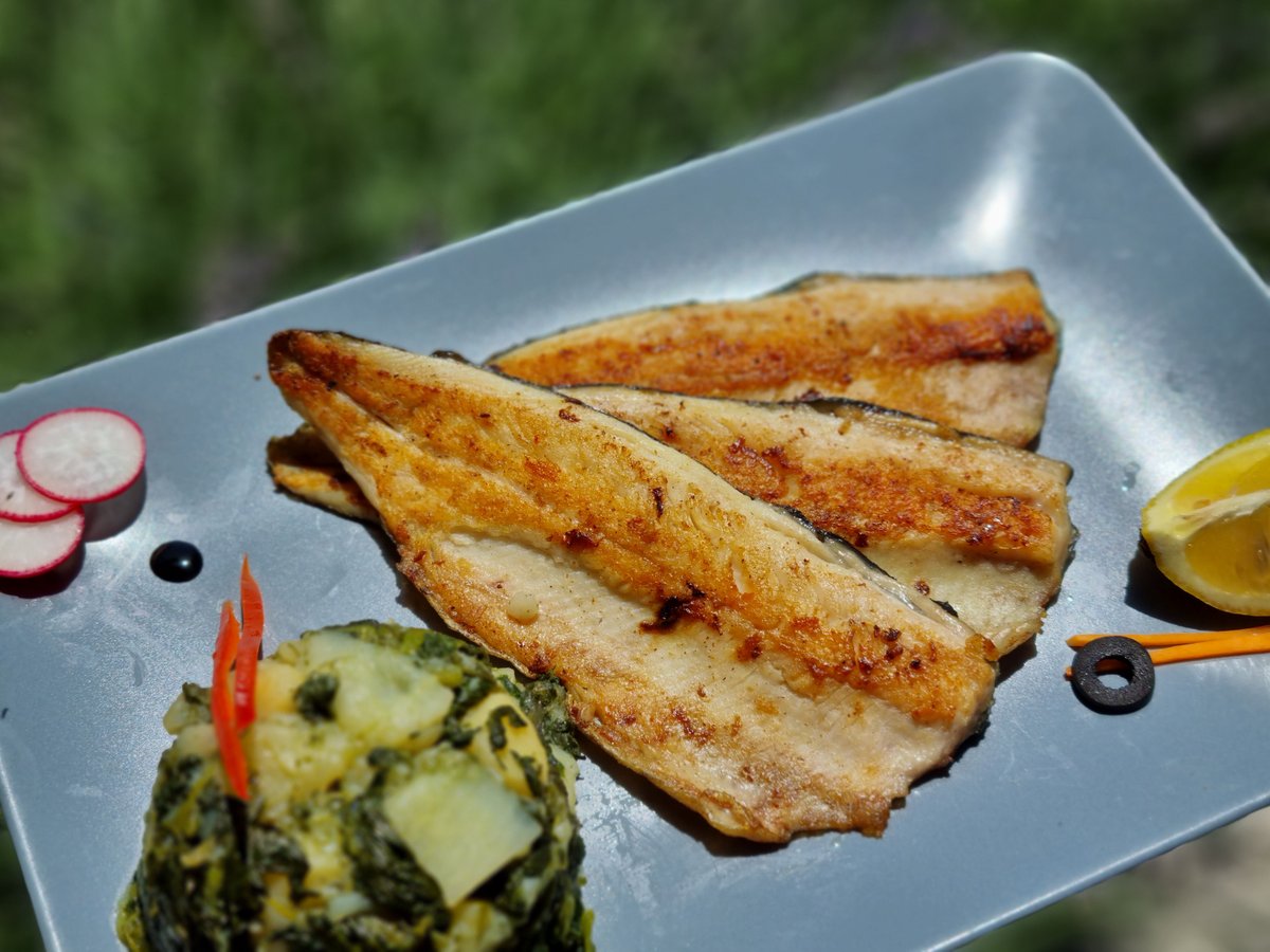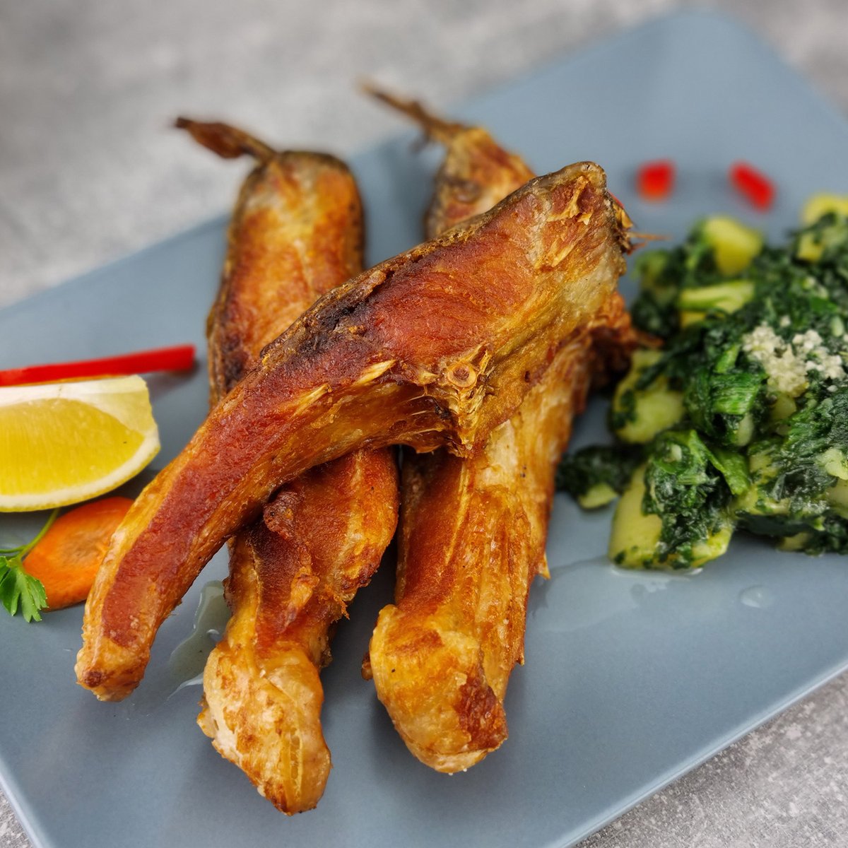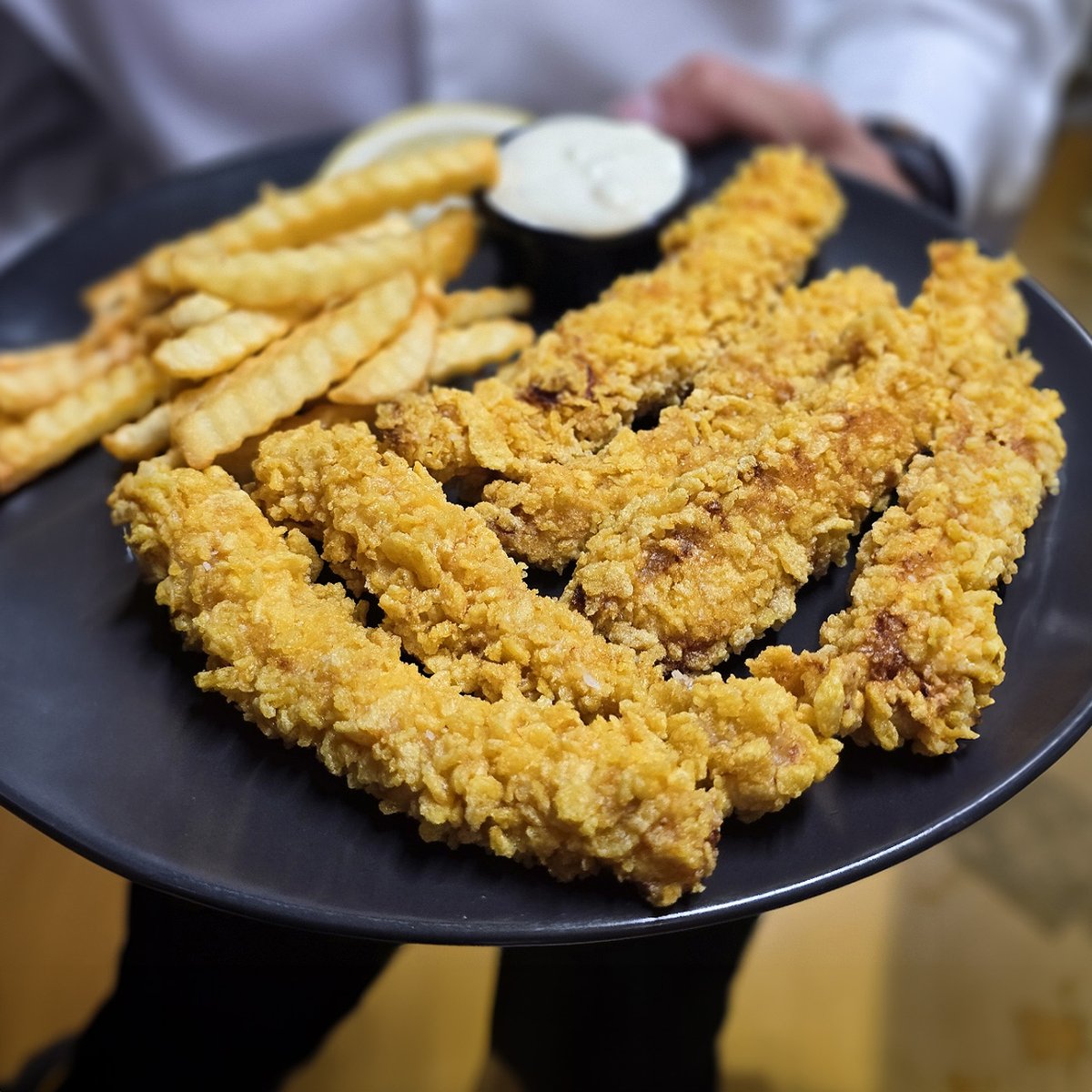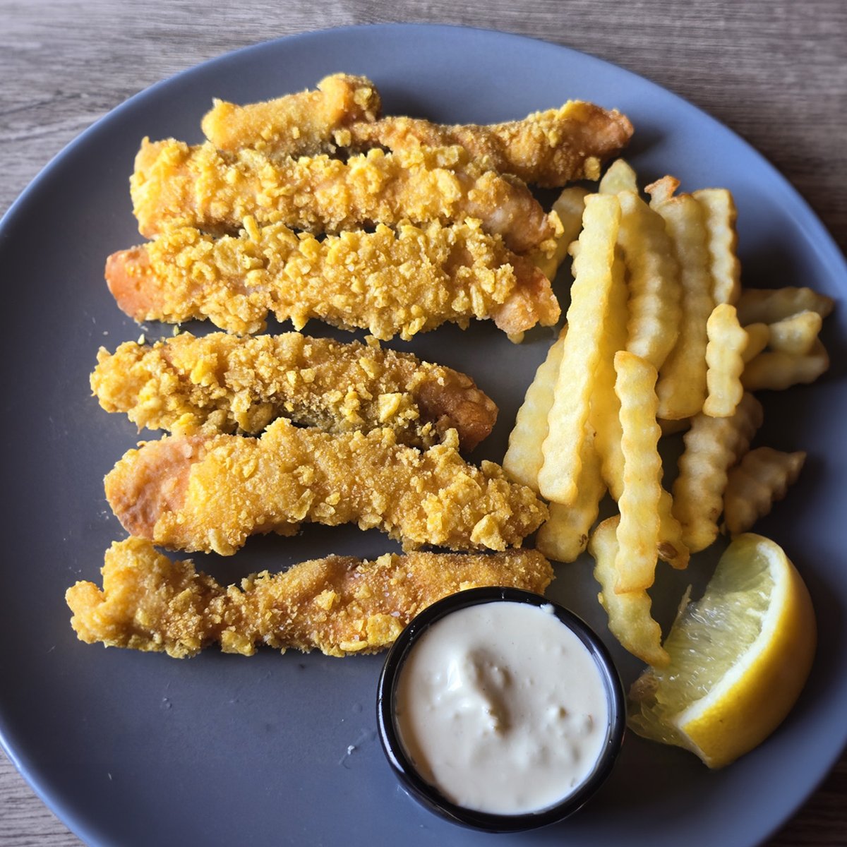 Filet oslića paniran u corn fleksu, bez jaja i mleka. Prilog pomfrit i dva umaka (taras sos i sweet chilli). Posno.