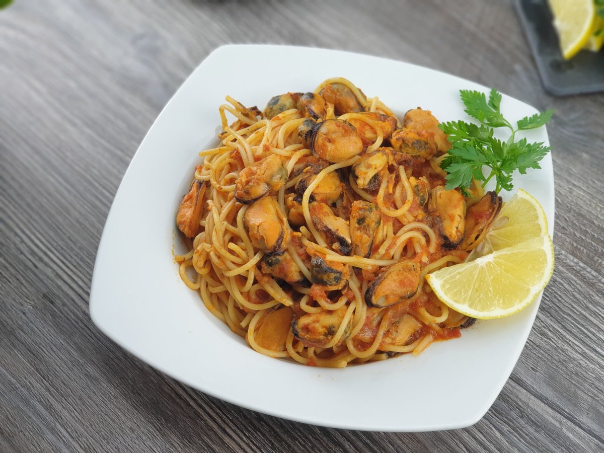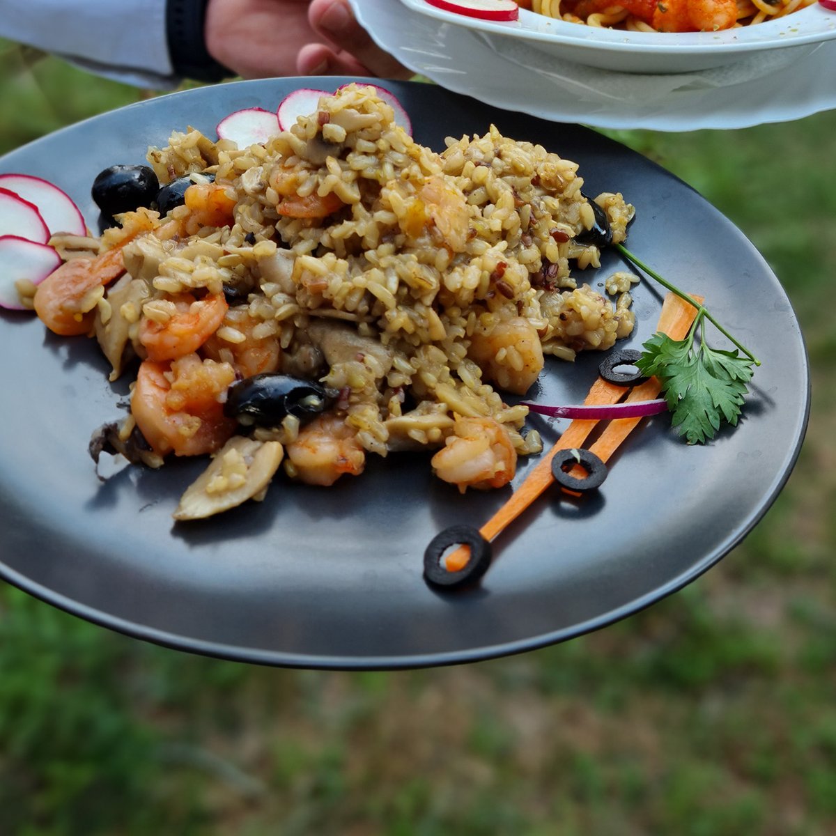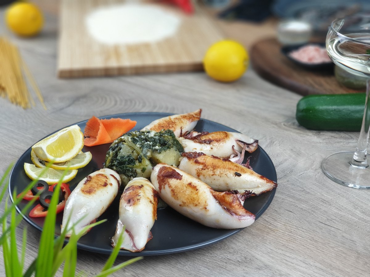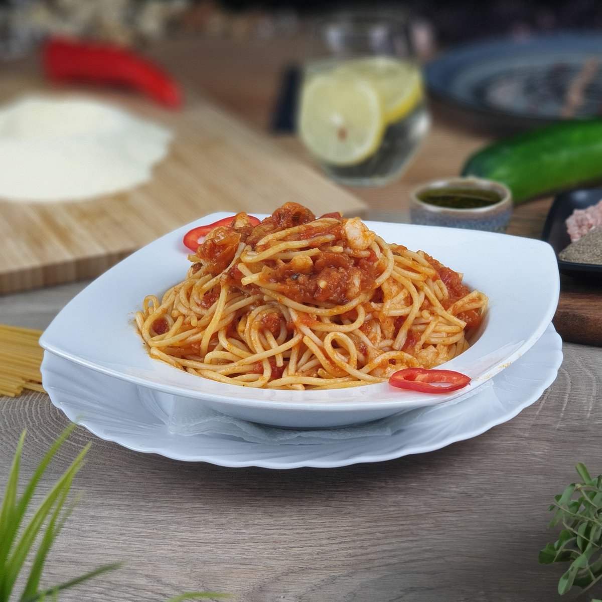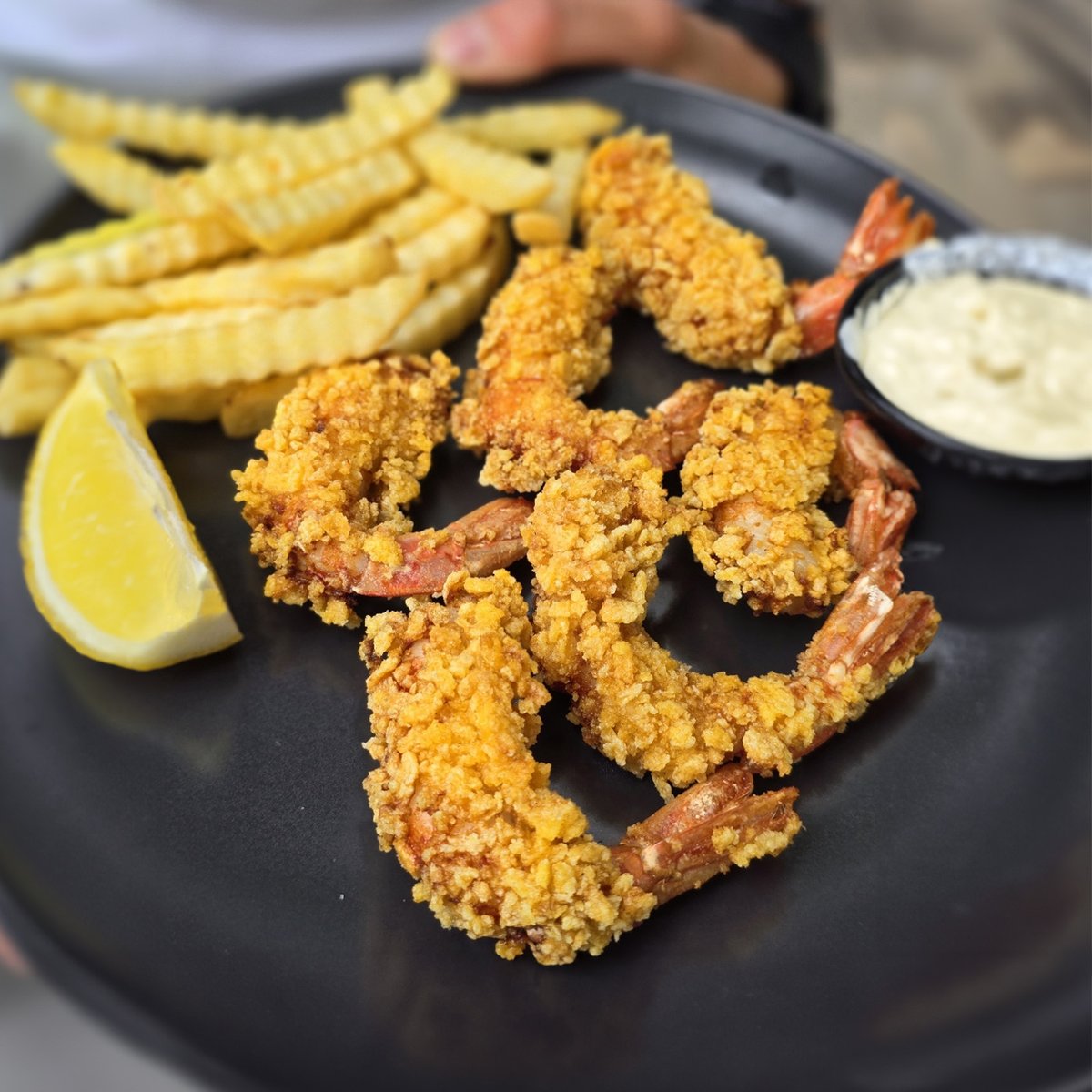 Očišćeni gambori panirani u corn fleksu, bez jaja i mleka. Prilog pomfrit i dva umaka (tartar sos i sweet chilli) Posno