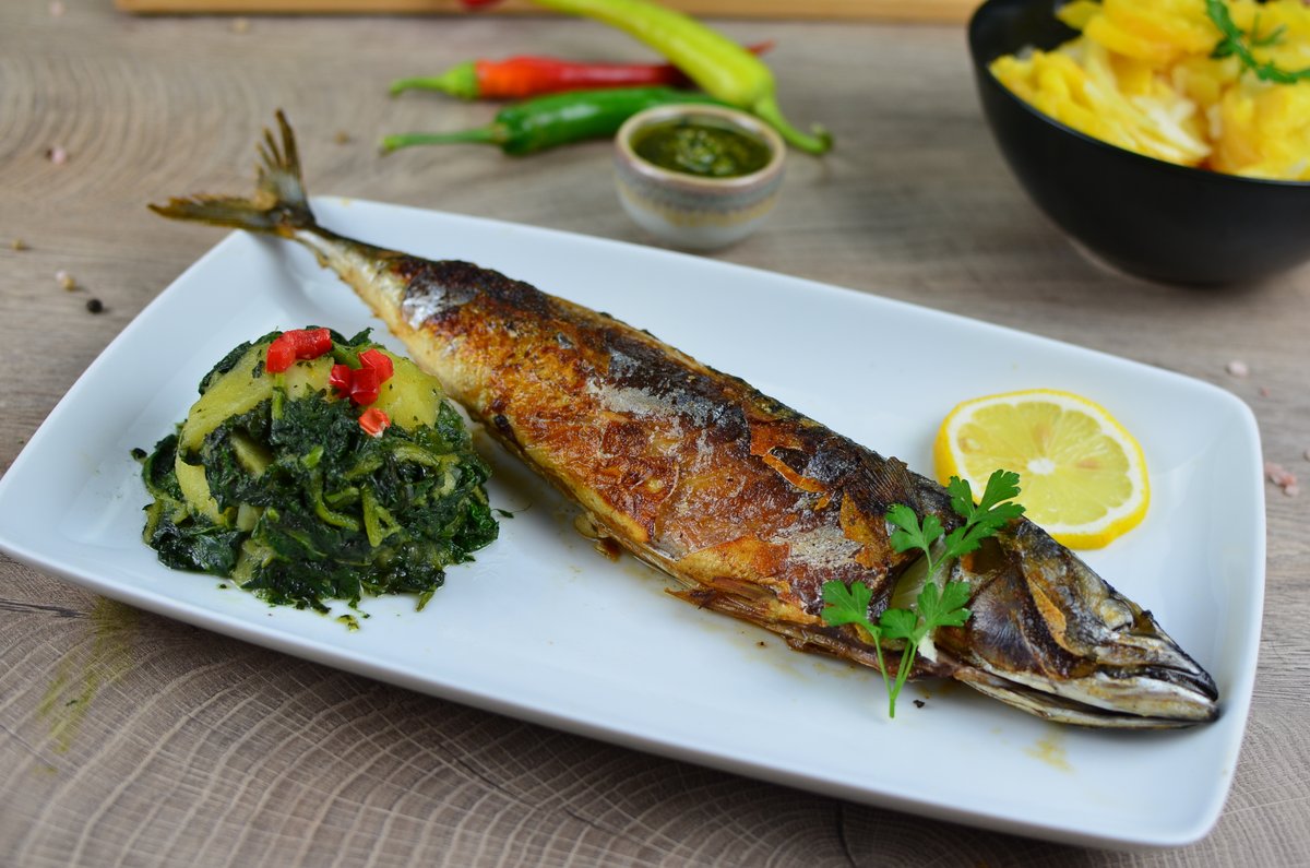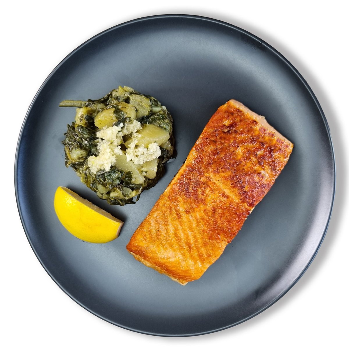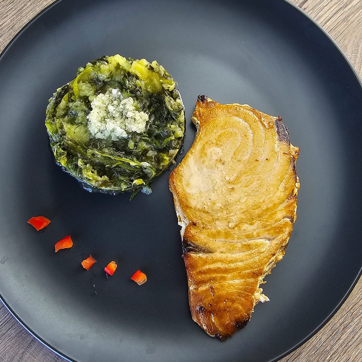 Filet losos paniran u corn fleksu, bez jaja i pavlake. Prilog pomfrit i dva umaka (tartar sos i sweet chilli) Posno