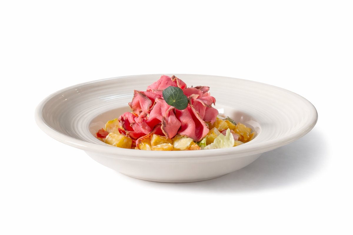 Salata sa rostbifom, pečenim krompirom i kiselim krastavcem