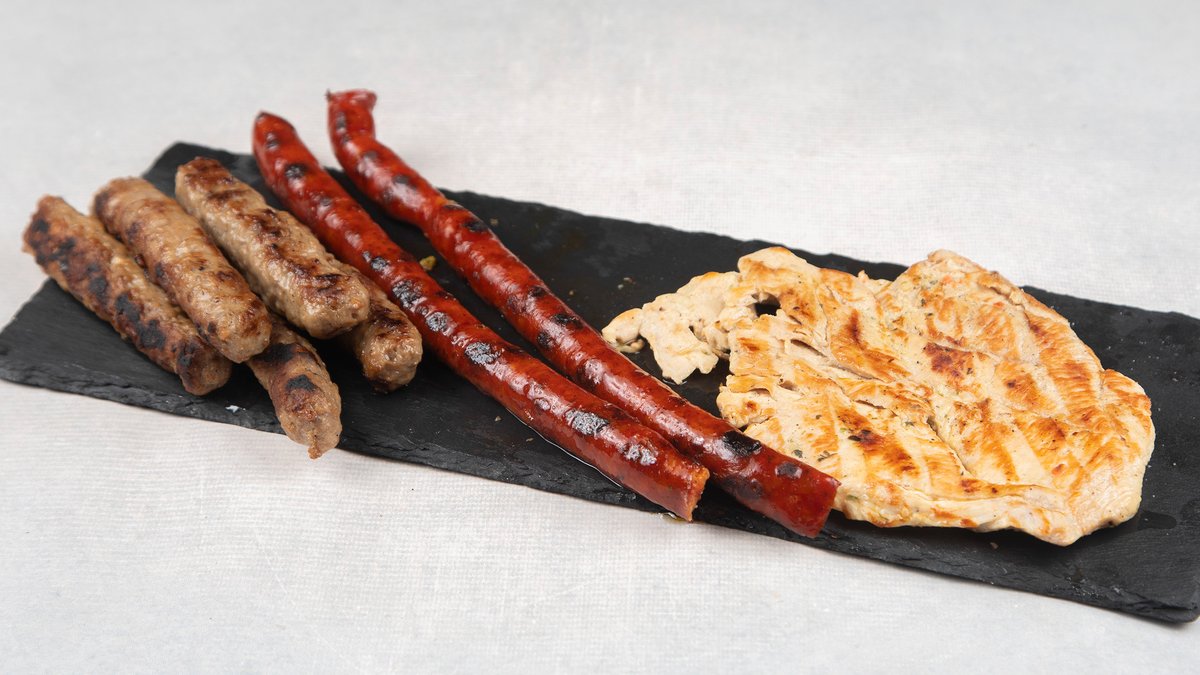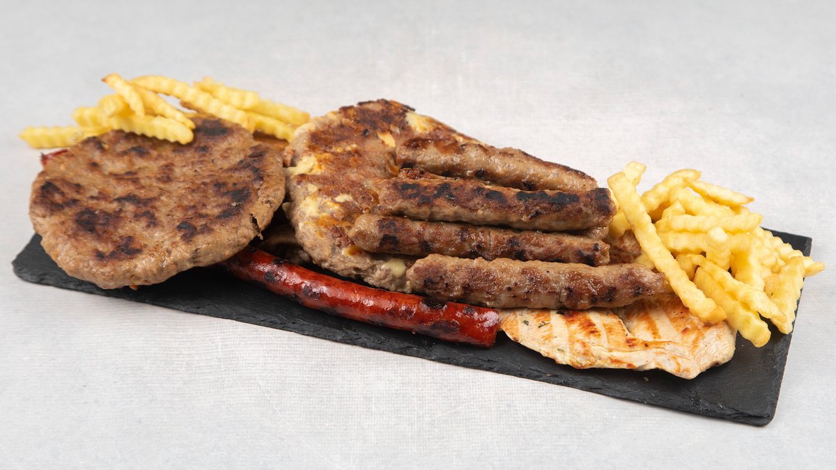 Pileće belo, pileći batak, kobasica, mala pljeskavica, ćevapi, gurmanska, pomfrit, 4 hleba, 4 salate