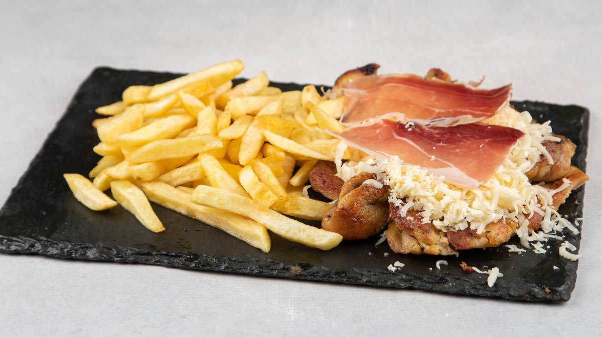 Belo meso sa kačkavaljem i pršutom, pomfrit, somun