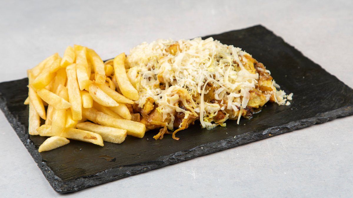 Seckana piletina, dinstani luk, šampinjoni, kačkavalj, pomfrit