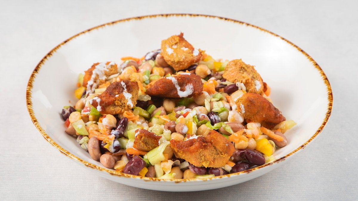 Chana masala(veg), bagara rice, protein salad (rajma chana, ground nuts, cucmber, tomato)