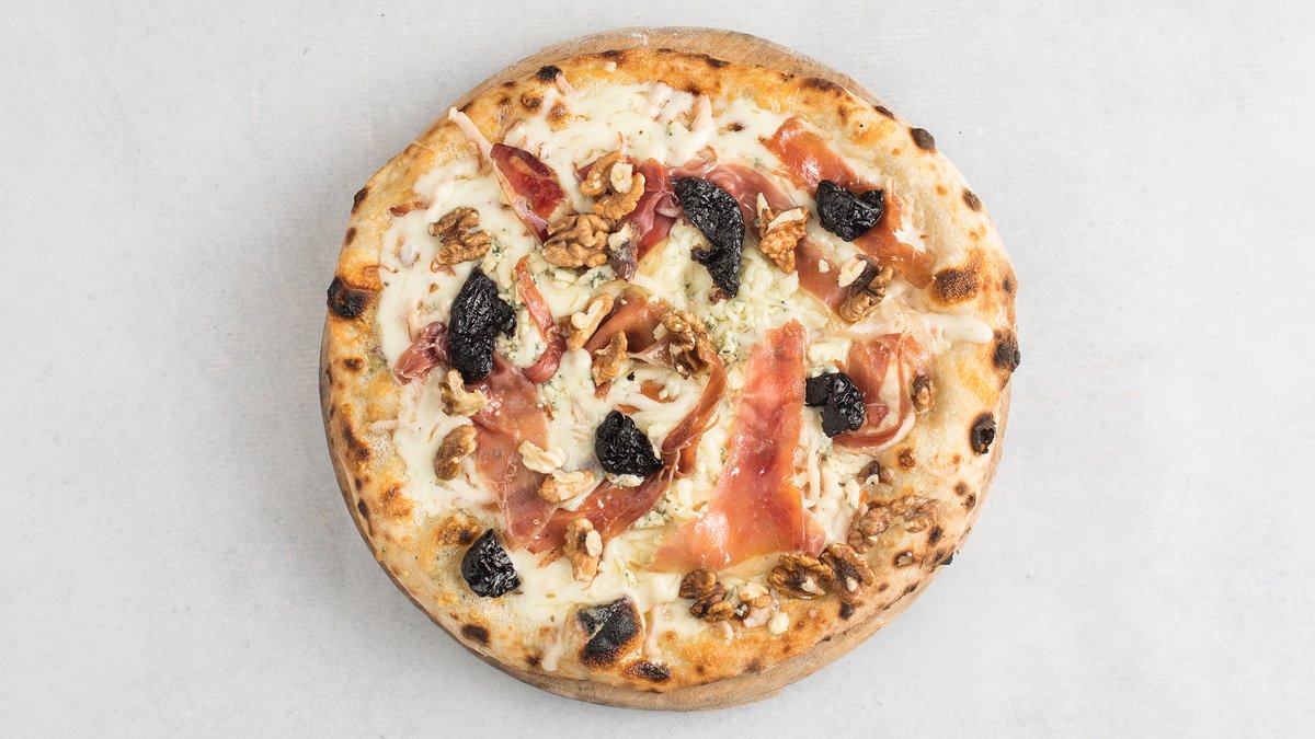 Pelat, Mocarela, Gorgonzola, Njeguška Pršuta, Rukola, Čeri, Parmezan
