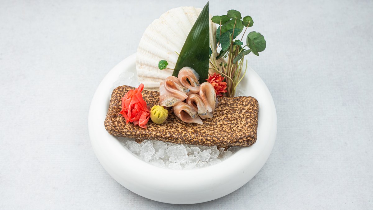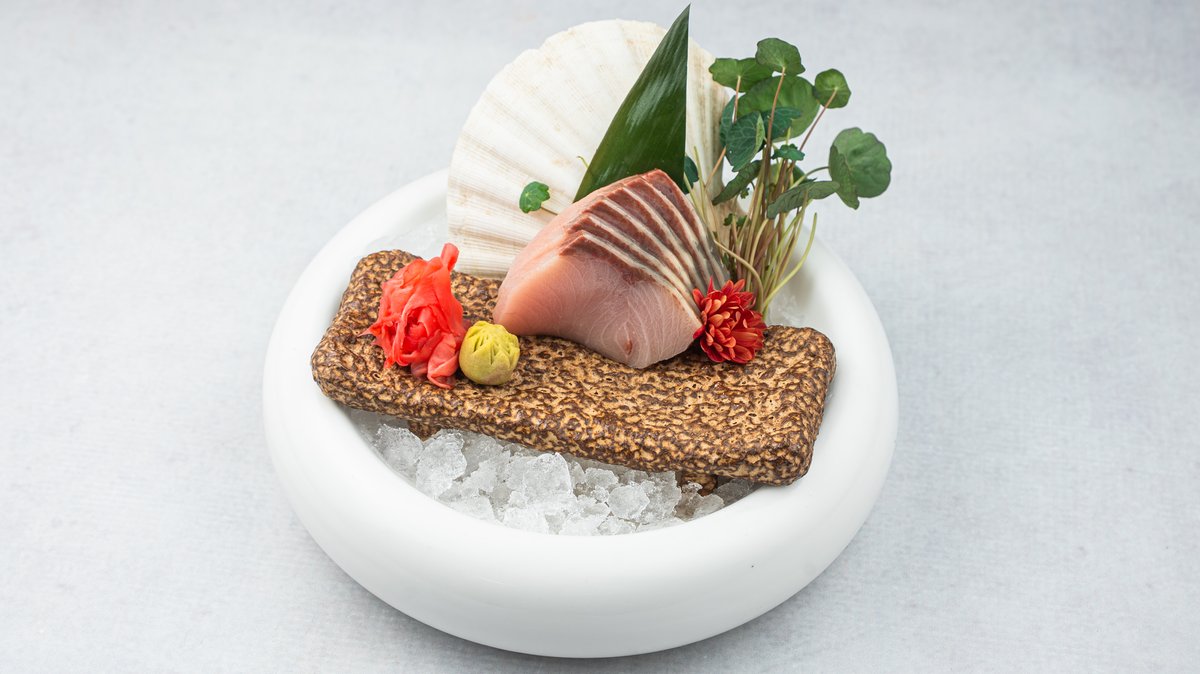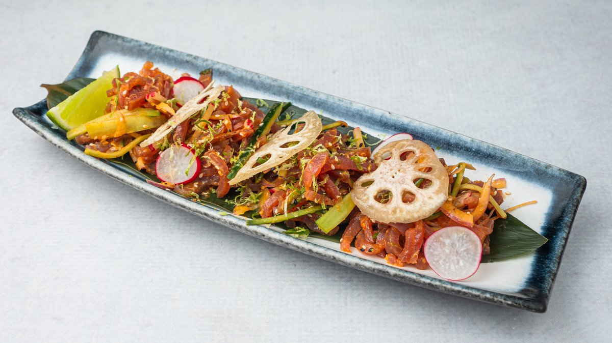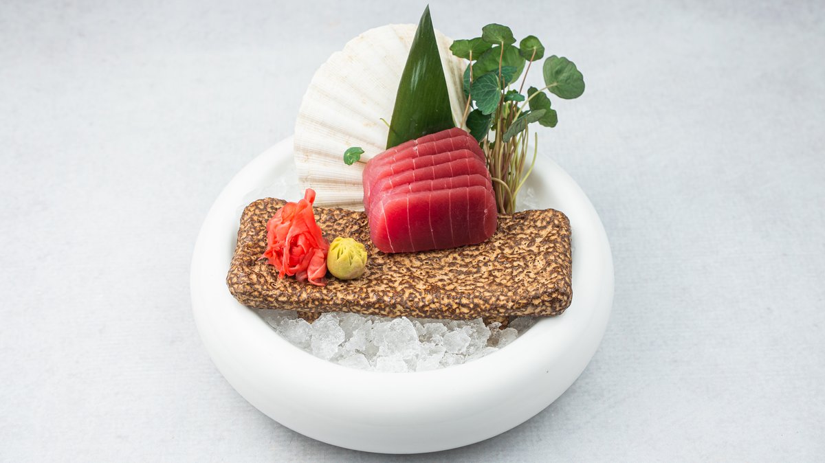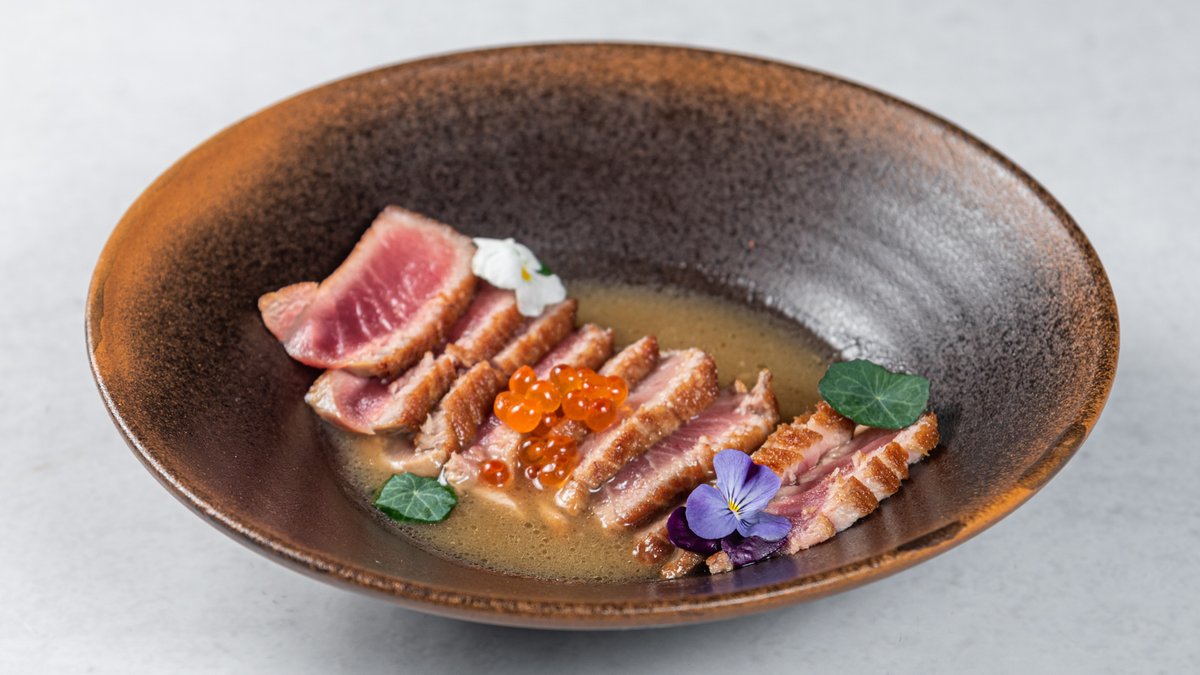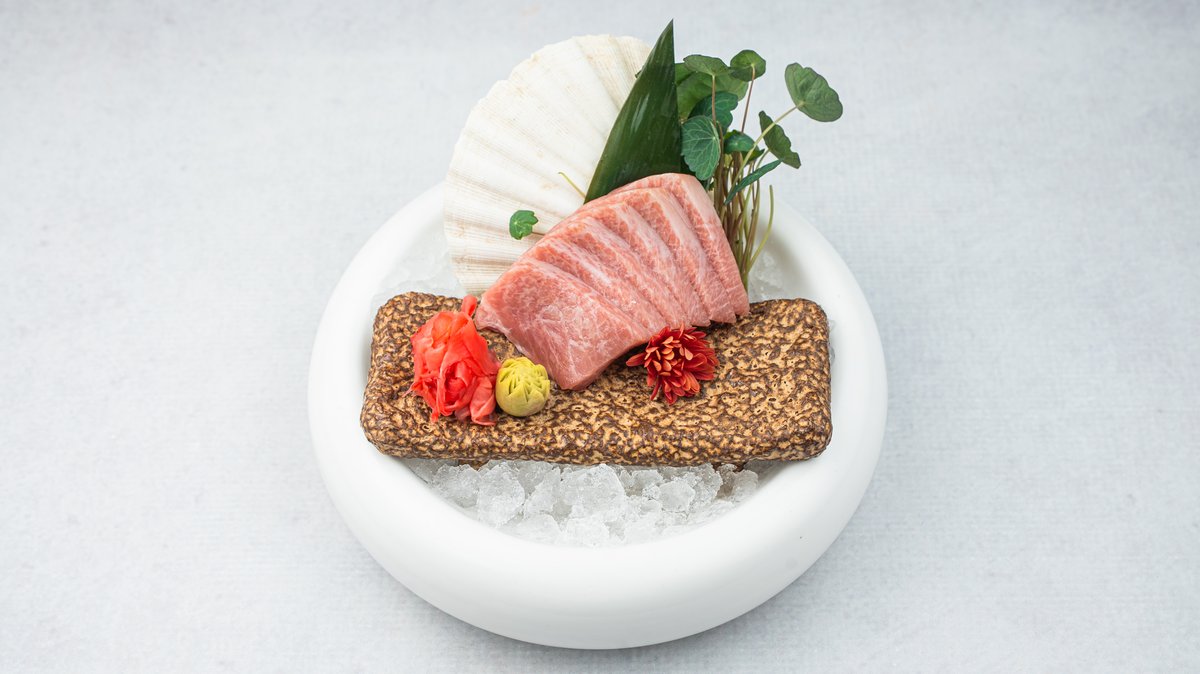 (Opečena marinirana, tanko sečena ''dry-aged'' tuna, servirana sa morskim algama, ikrom od lososa, belim lukom i susamom)